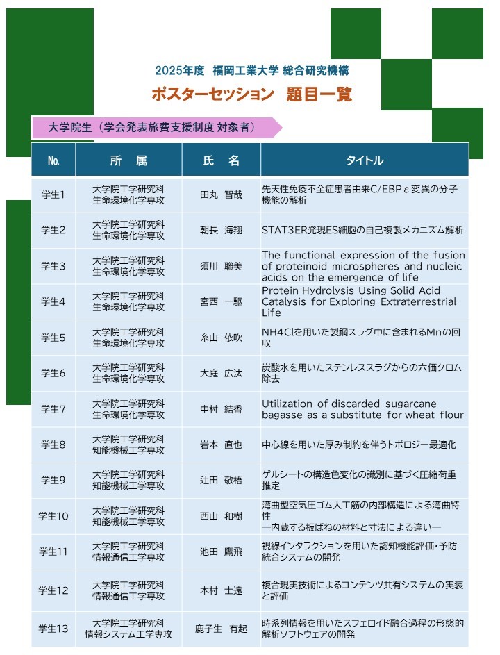 福岡工業大学は、教員の日頃の研究成果を広く地域・社会に還元するとともに、教員同士の交流促進による研究活動の活性化を目的として、「2025年度 福岡工業大学 研究成果報告会・ポスターセッション」を開催いたします。
